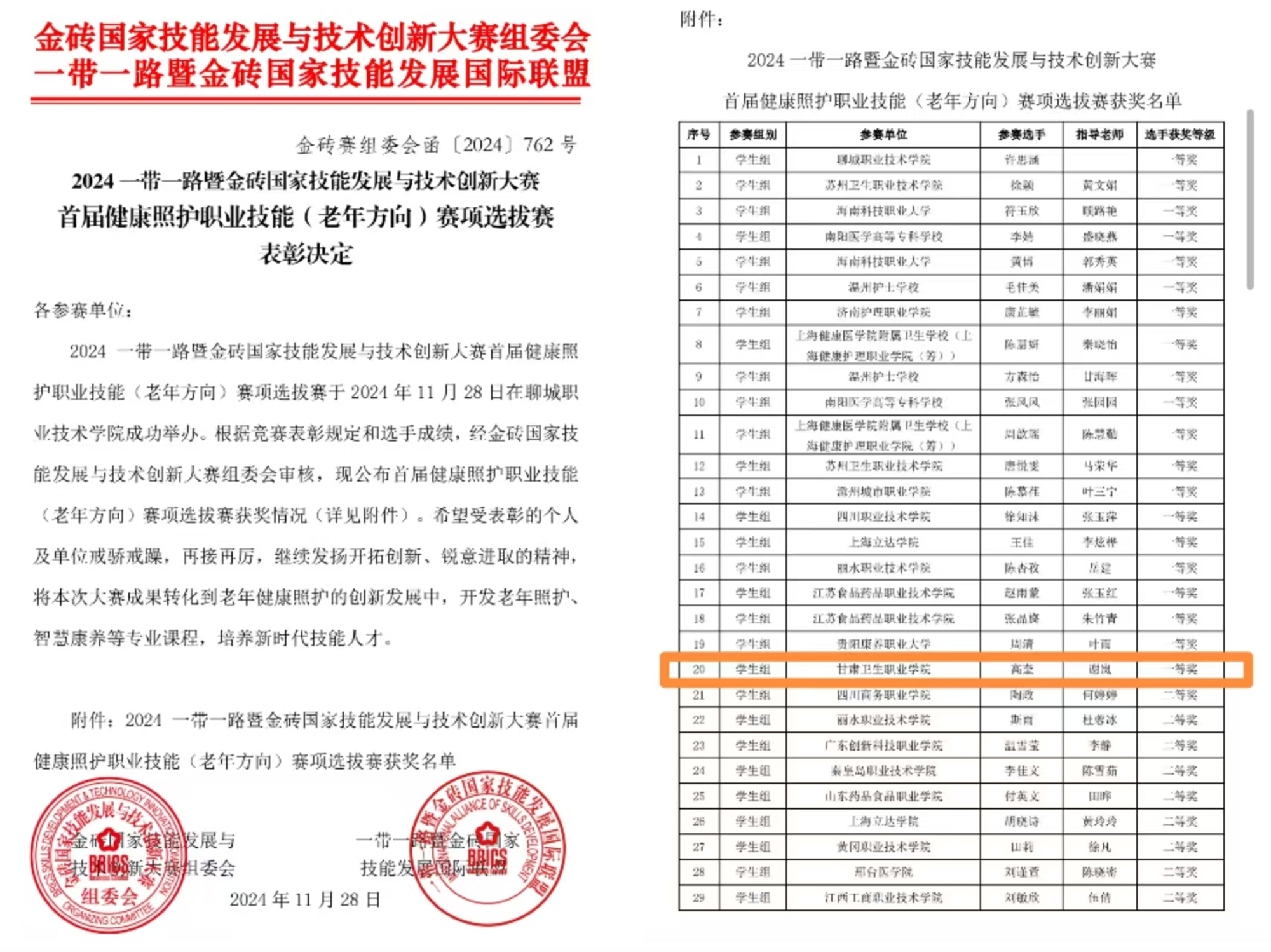 11月26日至12月1日,“2024一带一路暨金砖国家技能发展与技术创新大赛”首届健康照护职业技能(老年方向)赛项选拔赛在山东聊城职业技术学院举办。我校护理学院派出的高奎同学凭借扎实的专业技能和出色的临场表现,在来自全国25个省、自治区和直辖市111所院校的363名选手(包括3名国际选手)中名列第20名,荣获选拔赛一等奖。