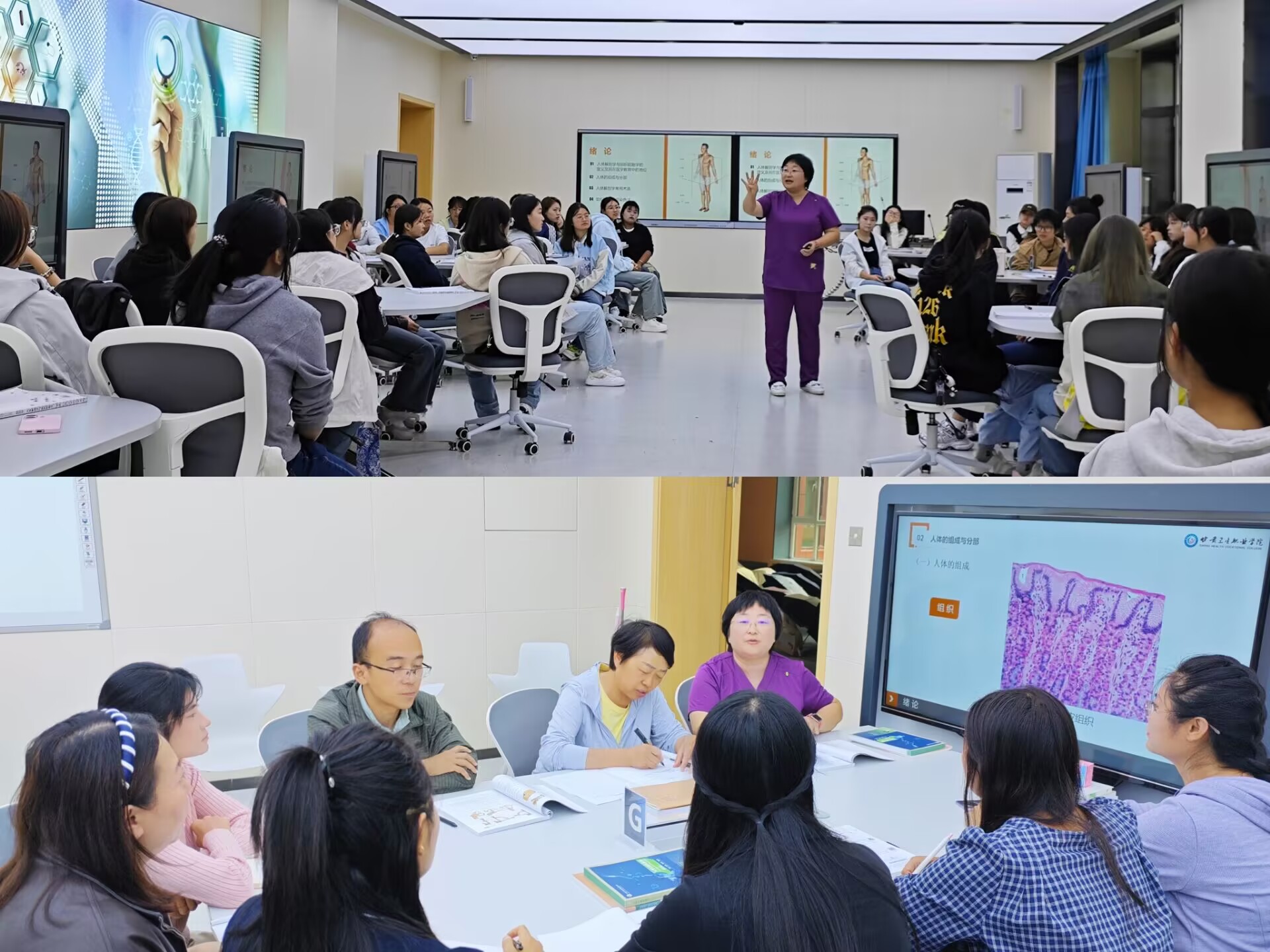 本次观摩以助产专业《人体解剖学与组织胚胎学》“开学第一课”为示范,以“守护生命的通道,科学与人文的双重旅程”为主题,由吕香茹副教授主讲。课堂伊始,吕老师以“提起‘助产士’,你首先想到的是什么?”这一问题开篇,迅速拉近与学生的距离,随后自然过渡到学科重要性的阐述,让学生明白《人体解剖学与组织胚胎学》是铸就助产专业硬核技术的基石。授课过程中,既从“科学精准性”解析“生命通道”结构,强调专业严谨性;又结合胚胎发育知识传递“人文关怀”,强化学生职业担当。同时紧扣甘肃基层医疗实际,升华工匠精神与人文情怀,实现知识传授与价值引领同频。