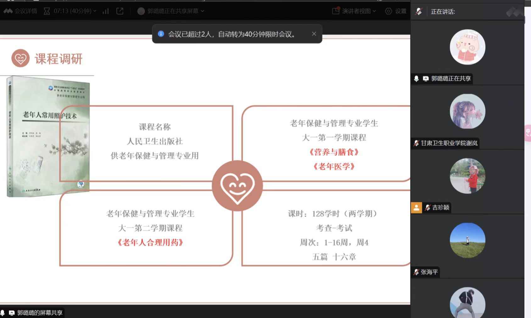 为进一步推动我校老年保健与管理专业的课程体系建设,2月27日,护理学院召开了线上集体备课会,来自护理学院、基础医学院及临床授课教师一同参加了会议。