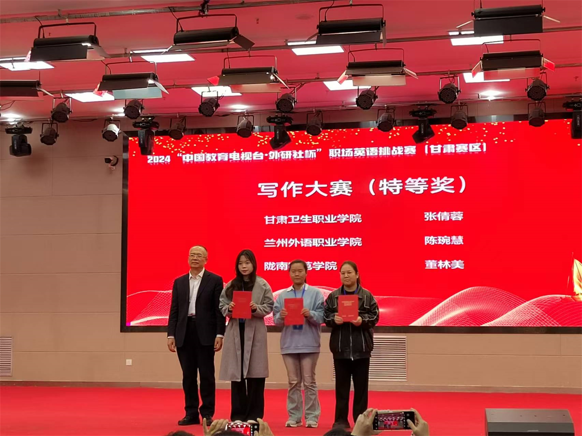 11月3日,2024年“中国教育电视台·外研社杯”职场英语挑战赛(甘肃赛区复赛)在兰州石化职业技术大学成功举办。我校学生张倩蓉以总分第一名的成绩获得写作大赛特等奖,高小静老师获优秀指导教师特等奖;汪婧、王筱两名同学获得写作大赛一等奖,魏莉莉、张奕林老师获优秀指导教师一等奖。唐瑞、苏燕妮、程祎楠三名同学获得演讲大赛二等奖,梁瑾、钱磊老师获优秀指导教师二等奖。