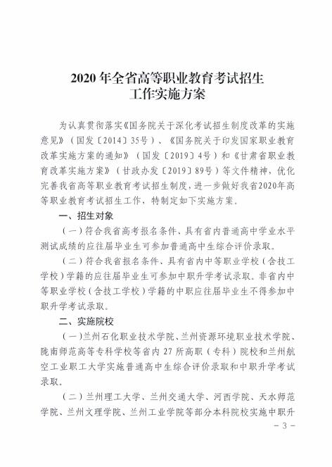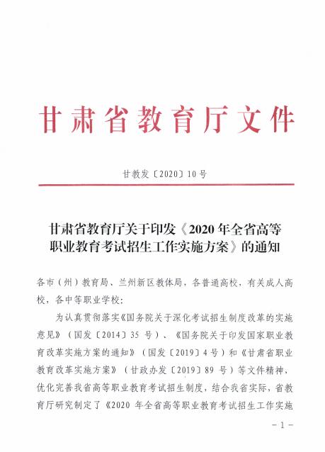 甘肃省教育厅关于印发《2020年全省高等职业教育考试招生工作实施方案》的通知