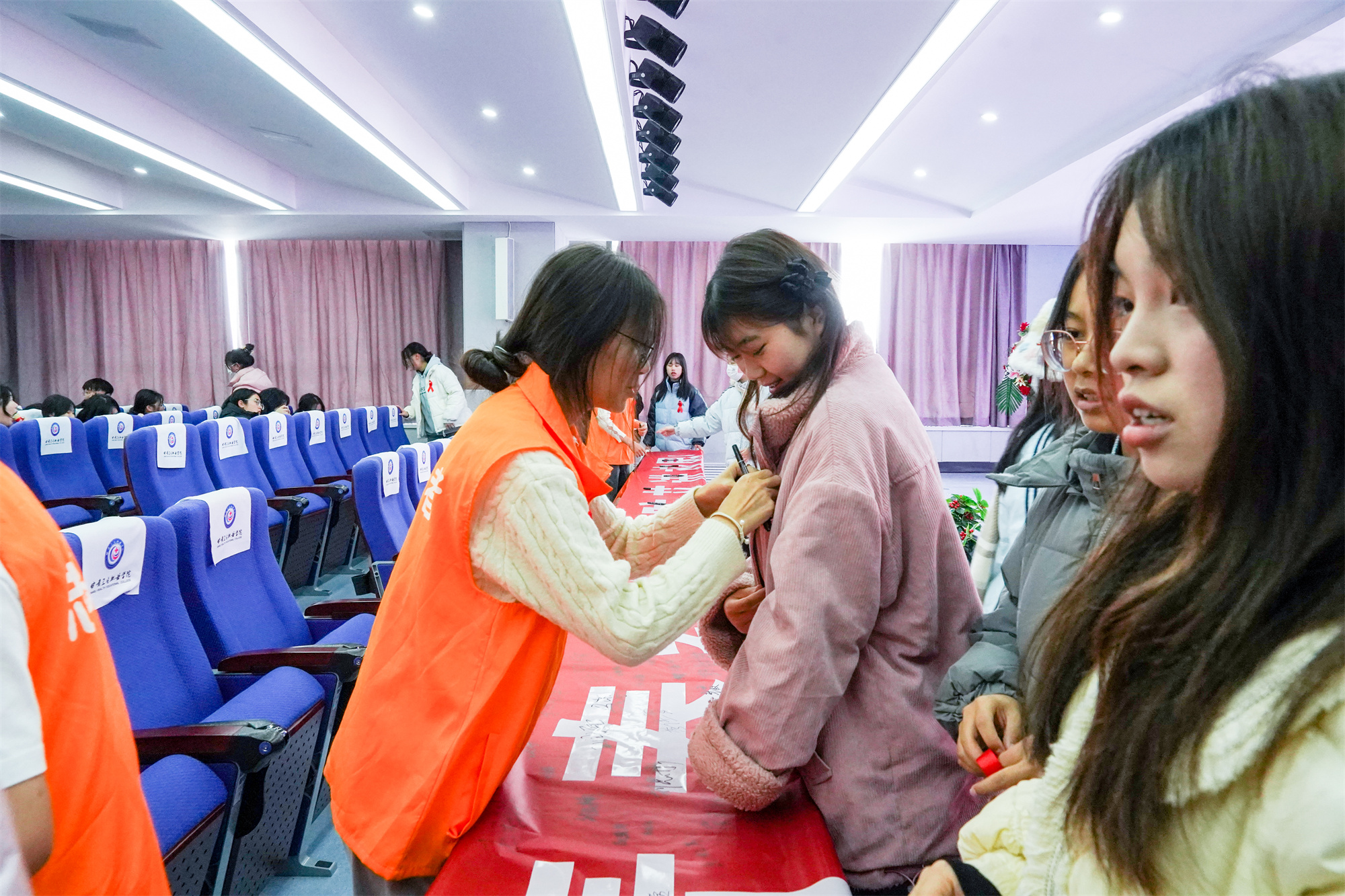 讲座结束后,“零歧视,防艾同行”为主题的防艾活动正式启动,师生们庄重地佩戴红丝带,将关爱与责任铭记于心。活动现场设置了多个环节,如“爱的抱抱”“佩戴红丝带”“签字仪式 ”“观看知识展板”,旨在提升学院师生对艾滋病的认知,消除对艾滋病患者的歧视,传递关爱与支持。