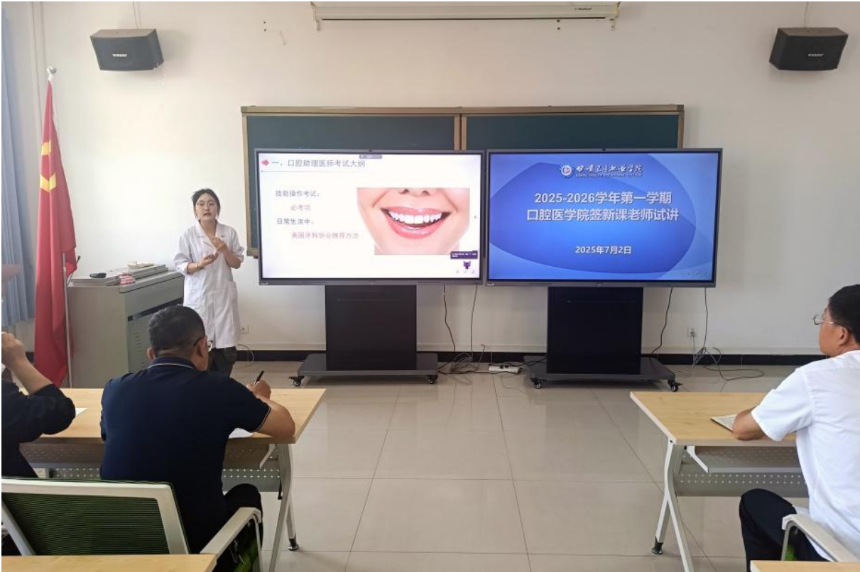 为保障新学期教学质量,强化师资队伍建设,7月2日中午口腔医学院组织开展了2025-2026学年第一学期签新课教师的试讲活动。学院领导班子、教务处干事、学院全体专职教师组成评审组参与了此次活动。