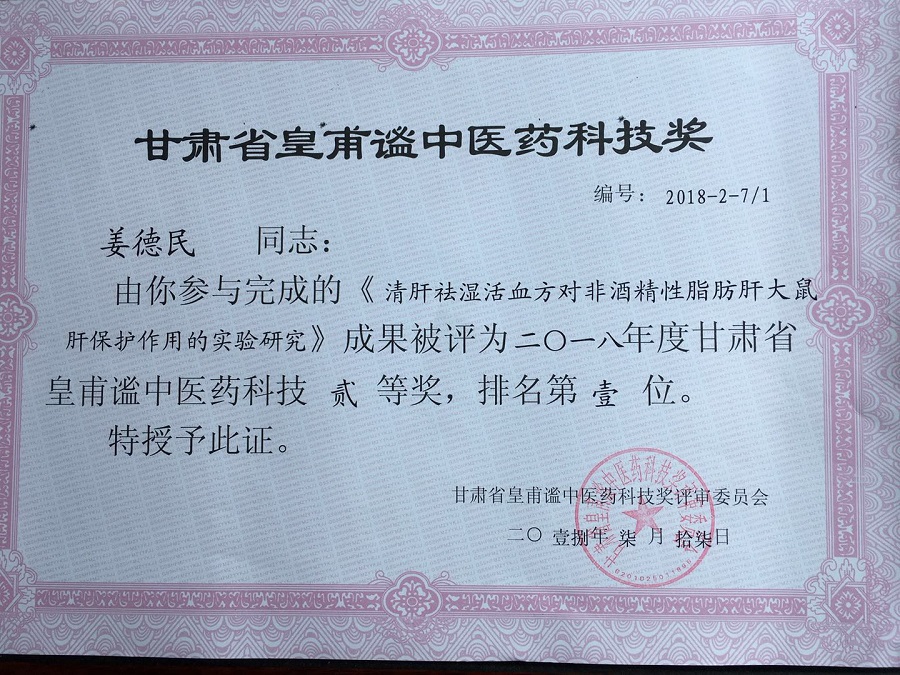 我院姜德民书记主持科研成果喜获2018年度甘肃省皇甫谧中医药科技二等奖发布时间:2018-09-25 -